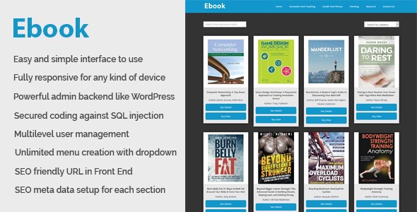 Ebook is a responsive eBook download management system built with PHP and MySQL. It has a nice and attractive front end interface that is really appealing.